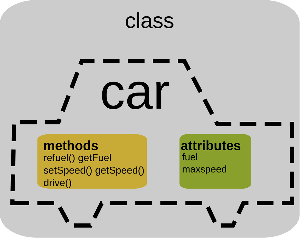 Above is a diagram of a class Car. Inside the class we can see the methods and attributes. We can see that the Methods respond to the Attributes, the fuel needing to be refuelled and max speed getting and setting speed of the class Car.