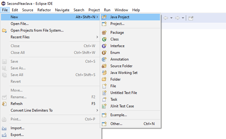 - Once Eclipse opens, click on File and go to New and then click Java Project.