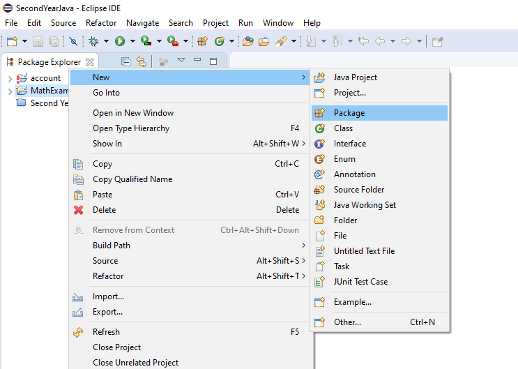 - After that is done. You will see the name of your project appear on the left-hand side of your screen. Right click on it, then go to New, and click on Package. Create a name for your Package, using Camel Casing.