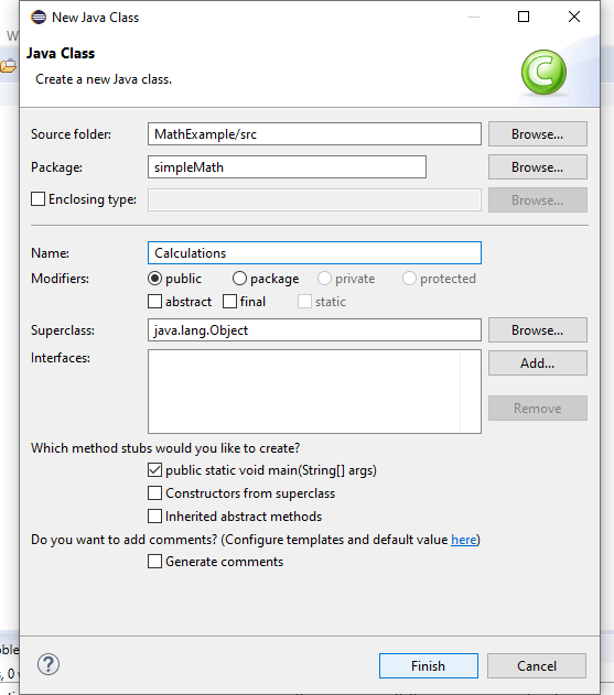 - As before, right click now on the package you just created. Go to New, then Class and create a Class. Ensure to click public static void main (String[ ] args). It’s handy having that enabled, because you could make a mistake typing it out yourself.